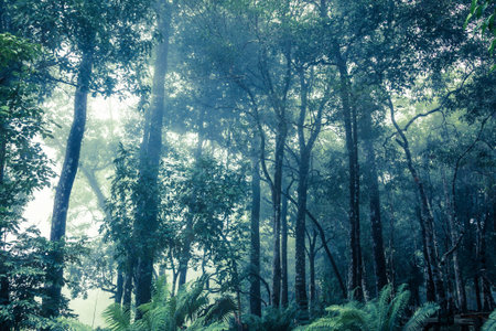 Tropical rainforest with sunlight and fog in the morning.