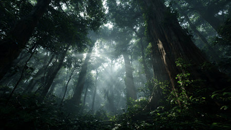 Sunlight filters through dense tropical rainforest canopy with a misty atmospheric glow