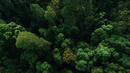 Aerial view of a dense, vibrant green forest canopy, showcasing lush tropical trees from above. Perfect for nature, environment, or conservation th...