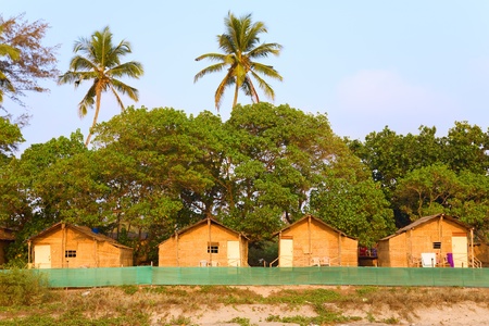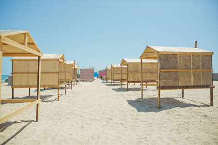 Beach huts . Houses on the beach of Caspian Sea . Summer Background . the seaside . wooden houses by the beach in Caspian Sea . Cabins at the sand beach. Sea sand