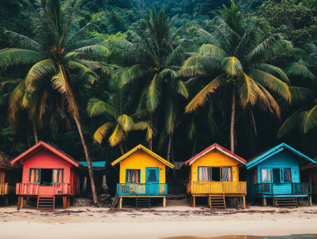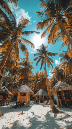 Experience a peaceful beachside paradise featuring palm trees, thatched roof huts, and pristine sand under a vivid blue sky, perfect for relaxation.