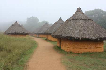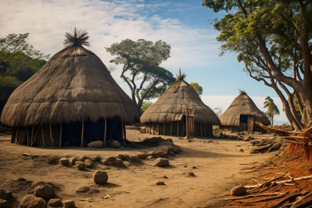 Serene view of straw-roofed huts in a tranquil african rural setting