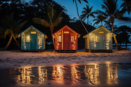 A row of vibrant beach huts in various colors stands next to a sandy beach, with trees in the background under a twilight sky. The scene captures a tranquil coastal atmosphere.