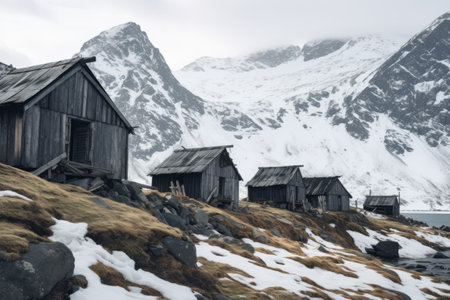 Majestic Retreat: Serene Gray Huts Amidst Snow-Capped Mountain Wonderland
