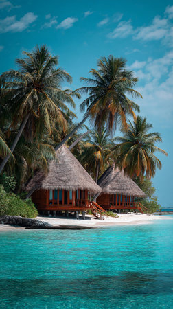 An idyllic scene presents a tropical island, featuring several small huts nestled amongst lush palm trees on a sandy shore. The composition is bathed in soft daylight, exhibiting muted tones of blue, green, and white. This image could be suitable for travel, vacation, or environmental themes within various commercial or editorial applications.