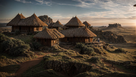 Warm sunlight illuminates a tranquil african village scene, featuring charming huts with thatched roofs, amidst a serene landscape, showcasing the essence of rural life and cultural heritage