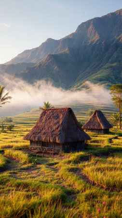 A tranquil rural village features traditional huts with thatched roofs nestled among dense greenery. Early morning light casts a warm glow on the dirt path weaving through the vibrant landscape, highlighting the serene atmosphere.