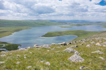 Turquoise lake among mountain peaks. High mountain river on summer day, hiking on rocks and stones