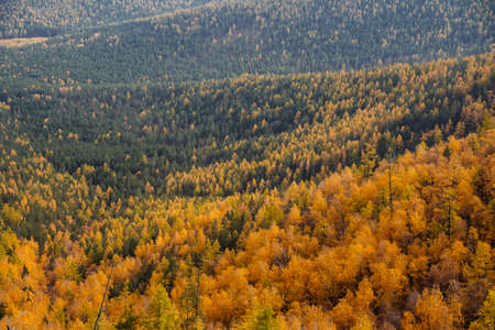 The taiga forest comes alive with an autumn symphony of colors, where fiery orange larches stand against backdrop of distant snow-dusted mountains, a celebration of seasonal change in the wilderness