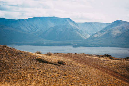 Dry Mongolian landscapes in the Altai Mountains, wide landscape.