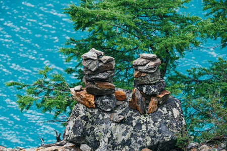 Pile of stones for tourists on shore of blue lake. Sea rocky shore on summer day. Meditation on nature