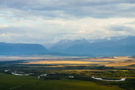 Scenic landscape with vast plateau with mountain river and forest in sunlight on background of snowy mountain ridge under cloudy sky. Green mountain valley in sunshine and mountain range on horizon.