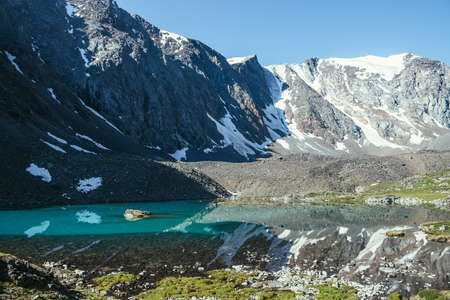 Snowy mountain reflected in clear water of glacial lake. Beautiful sunny landscape with glacier reflection in water surface of mountain lake under clear sky. Snow on rock reflected in mountain lake.