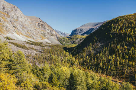 Scenic autumn landscape with narrow valley and mountains with coniferous forest of orange larches trees under blue sky. mountain vastness in golden sunlight. Beautiful highland view in autumn colors.