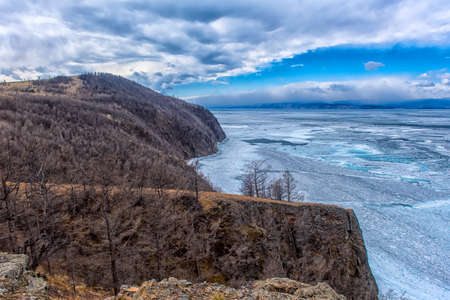 Ice on Lake Baikal in the spring and cliffs of Cape Khoboy