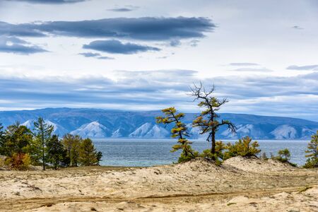 Lake Baikal, tree and mountains of Siberia with beautiful sky and clouds, Russia Oklhon island