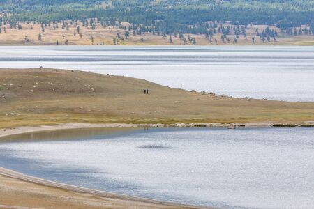 Majestic view of lake Khövsgöl, beautiful mountains in the background. Water coast with the misty looking sky with the clouds in horizon.