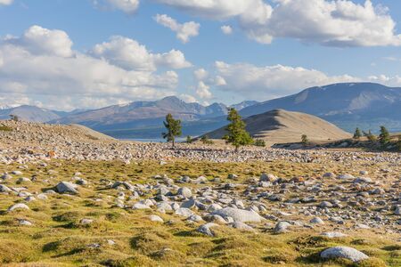 Mountain valley, yellow field with car tracks, larch trees in the middle of the day. Low clouds. Altai region. Snow peaks in the background