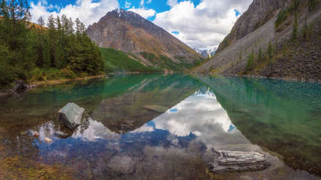 Beautiful reflection of mountains, sky and white clouds. Picturesque mountain lake in the dramatic day. Panoramic view.
