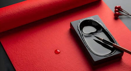 Japanese calligraphy pen and inkwell on red and black background