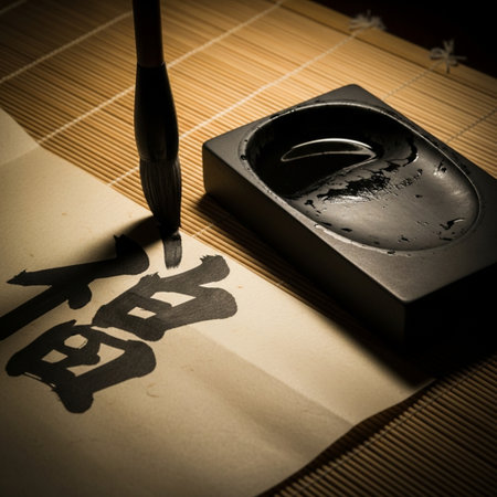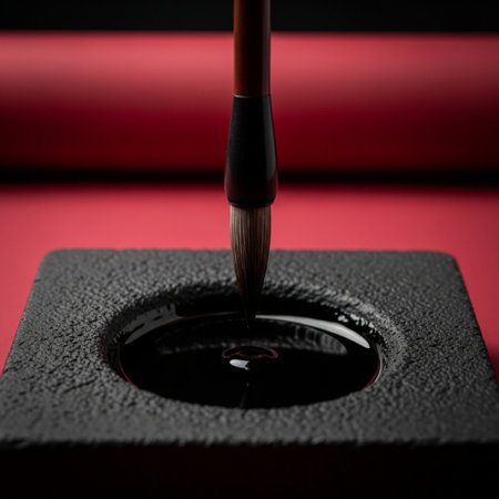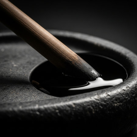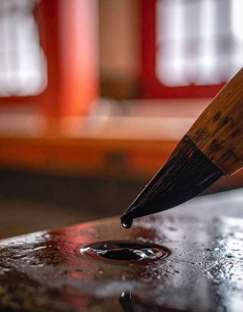 In a moment of quiet contemplation, a traditional calligraphy brush is gently dipped into a rustic inkwell, the black ink rippling in anticipation.