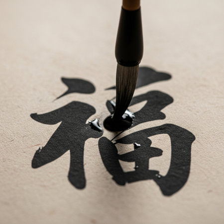 Human hand guiding a bamboo brush to paint intricate asian calligraphy characters on paper, showcasing traditional technique, focused skill, and meditative artistic heritage