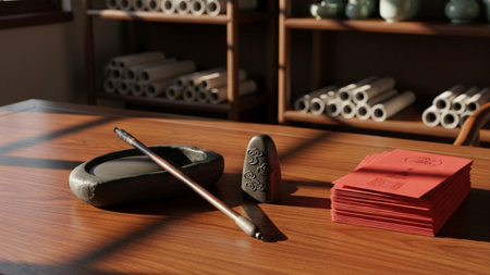 Calligraphy tools are neatly placed on a wooden table with traditional writings. A tea cup enhances the calm ambiance of the setting.