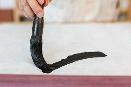 Hand, closeup of brush in ink for writing and calligraphy or ancient stationery for art and inkstone. Japanese creativity, black paint with paintbrush and person stroke with traditional vintage tools