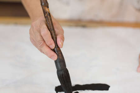 Beatiful chinese characters written by a professional calligrapher in Qufu, China. His hand is doing delicate movements to write for a customer.