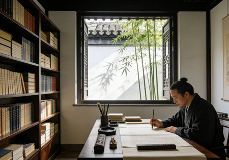 A captivating view of a traditional Japanese calligraphy studio filled with artistic tools, beautiful works, and a serene atmosphere perfect for creativity and inspiration.
