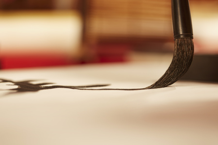 Chinese calligraphy brush on white paper, closeup of photo