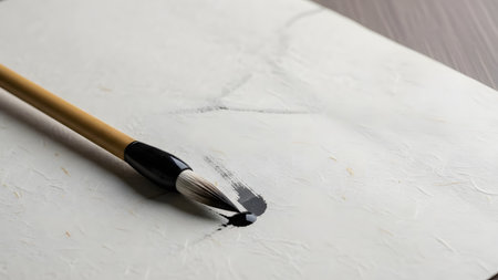 A traditional bamboo calligraphy brush resting on textured rice paper, with a fresh mark of black ink at the tip. The minimalist composition captures the essence of Asian art, writing, and creative expression.