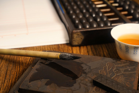 Abstract white paper with bamboo calligraphy brush and inkstone on old wooden table. picture for add text or greeting card chinese new year. Chinese traditional painting text