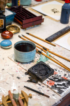 Accessories for chinese or japanese calligraphy. Special writting pen, ink on white background top view.