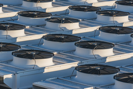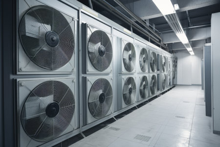 Industrial cooling systems with ventilation fans showcase advanced machinery in a modern facility. The setup emphasizes efficiency and airflow.