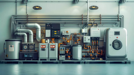 Industrial water treatment and boiler room. Shiny steel metal pipes, piping, connections. Industry, technology, biotechnology, chemistry, heating, work safety, special equipment