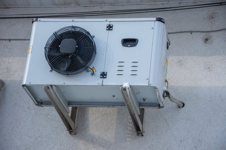 Outdoor air conditioner split system unit on white wall with copy space. HVAC industrial appliance