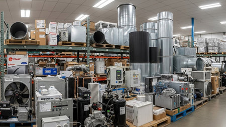 A wide shot of a warehouse interior filled with various HVAC and industrial ventilation equipment. Shelves are stacked with boxes and components. Prominently displayed are large metal ductwork pipes, air handling units, compressors, fans, and electrical control panels. The scene showcases a comprehensive inventory of parts and machinery essential for heating, ventilation, and air conditioning systems in and industrial settings. The lighting is bright, typical of a large storage facility.