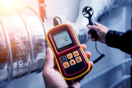 Technician use hand-held anemometer measuring air flowing measurement, wind speed and pressure. Modern equipment