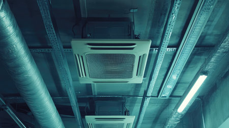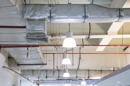 Air conditioning and hvac installation under exposed ceiling for interior finishing with copy space