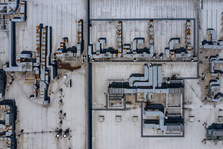 Ventilation System on the Building Roof. Rainy Weather. Industrial Air system of ventilation and Air conditioning. Aerial Shot.