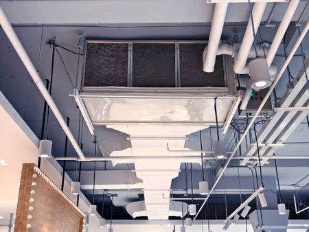 Ventilation system and pipe systems installed on industrial building ceiling.