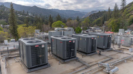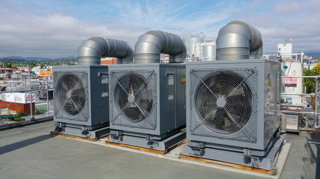 Industrial cooling systems with ventilation fans showcase advanced machinery in a modern facility. The setup emphasizes efficiency and airflow.