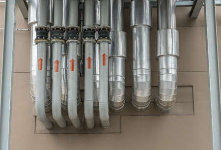 Ventilation pipe system at the ceiling of an industrial enterprise or plant premises.