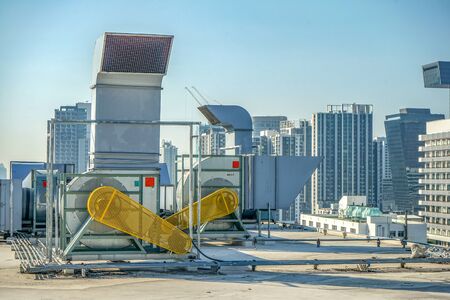 Air conditioners on the roof of the building in the morning.