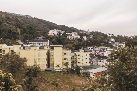 Panoramic shot of an urban landscape from high above of Juiz de Fora town in Minas Gerais state of Brazil: multiple multistorey residential and office buildings, favelas, parks, and hills, bright day