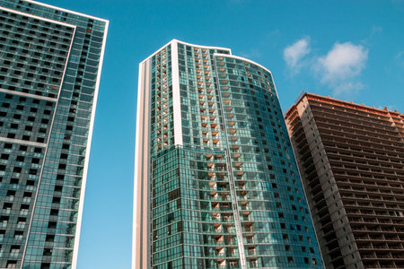 A vertical shot of high rise buildings in a glass facade with reflective windows