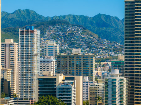 Urban Skyline of Honolulu with Mountain Backdrop in Hawaii