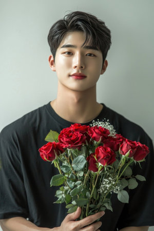 Handsome young Korean man holding a beautiful vibrant bouquet of red roses in a studio portrait setting The romantic gesture and elegant styling evoke a sense of and special occasion