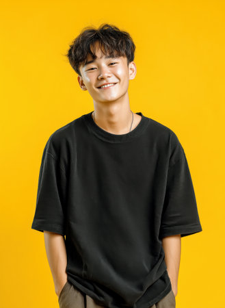 Portrait of a smiling young asian man on a yellow background